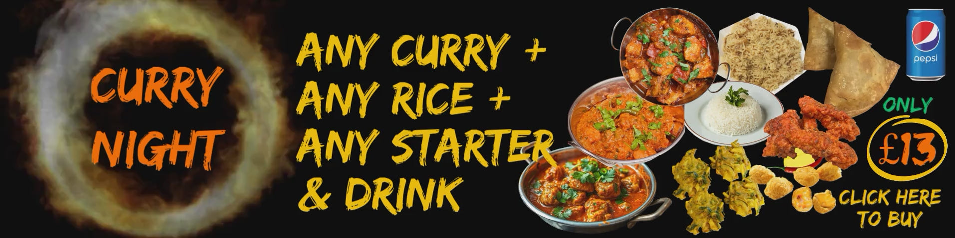 Curry Night Choose any Curry + Rice + Starter + Pepsi Drink