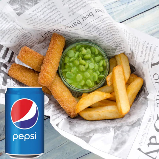 Kids Meal Deal 2 : Fish Fingers (4) with Chips and Mushy Peas and Pepsi Can