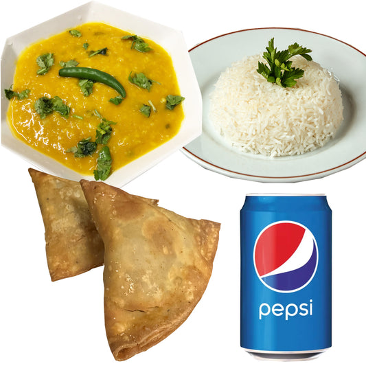 Meal Deal 5 : Yellow & Red Lentil Dal with Boiled Rice, 2 Veg Samosa and Pepsi Can