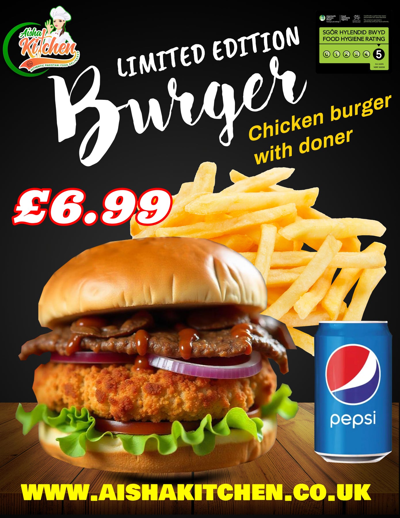 LIMITED EDITION CHICKEN BURGER WITH DONER MEAT AND CHIPS AND DRINK MEAL DEAL